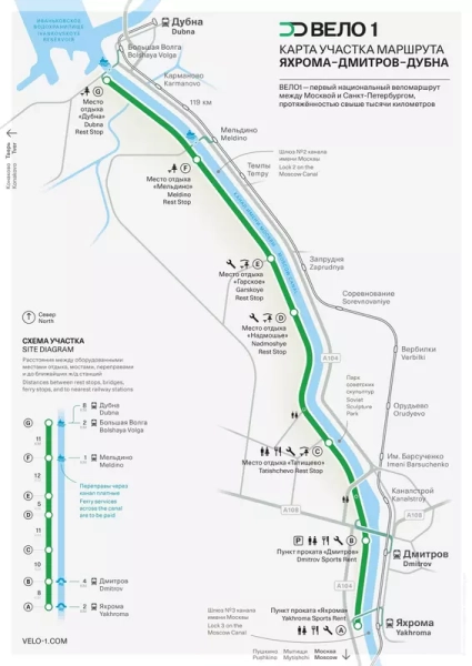 Велосипедная трасса длинной 56 километров, проложенная между городами Дубна и Яхрома. Это атмосферный маршрут, следуя которому можно насладиться красотой природы и свежим воздухом.Вело 1 — первый обустроенный велосипедный маршрут для туризма длинной более 1000 км между Москвой и Санкт-Петербургом.В основе разрабатываемого мастер-плана маршрута заложены принципы активного и экологичного формата проведения отпуска или выходных между Москвой и Санкт-Петербургом.