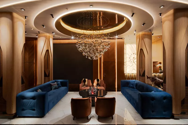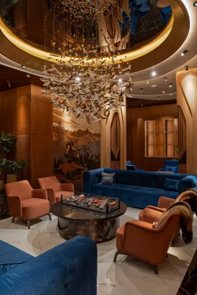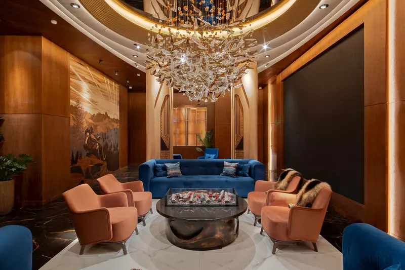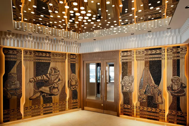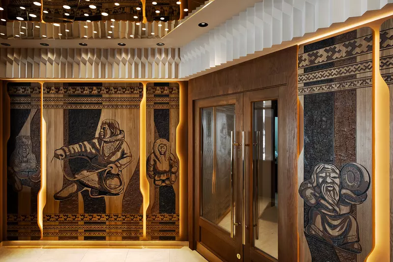 Черты современного стиля проявляются в присутствии технологий. Так, в лобби отеля размещен огромный LED-экран, на котором демонстрируются фильмы о красотах Колымского края, редкой по улову рыбалке и настоящей охоте.