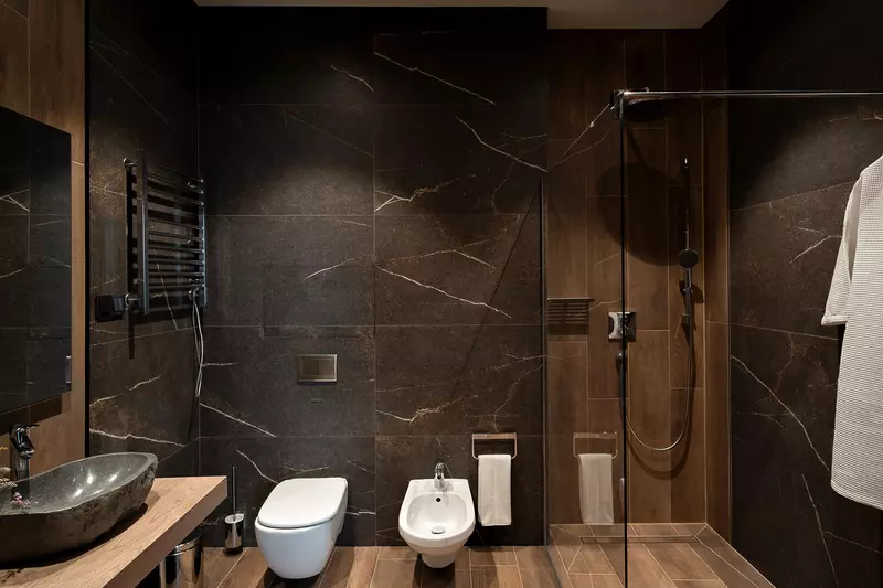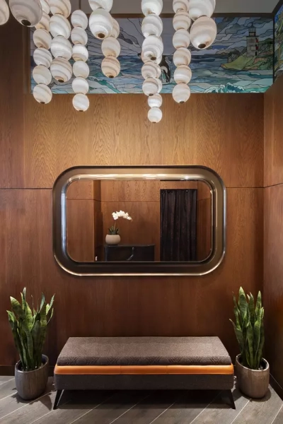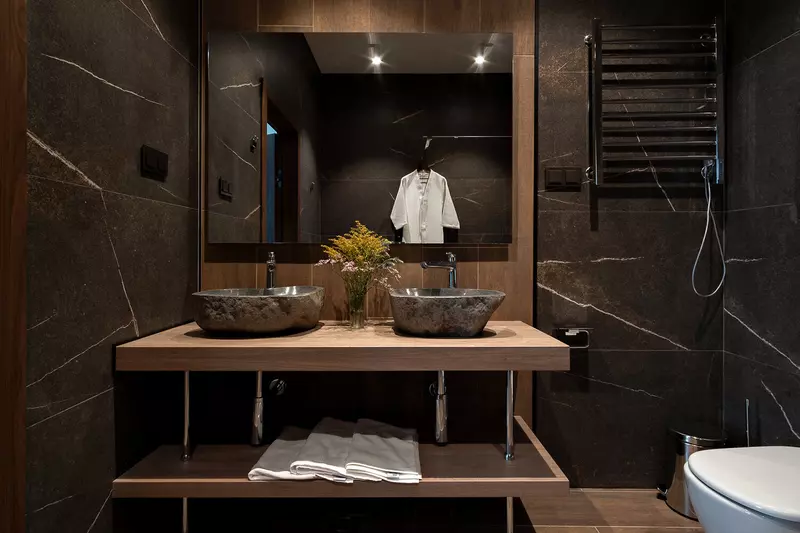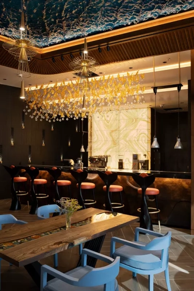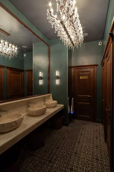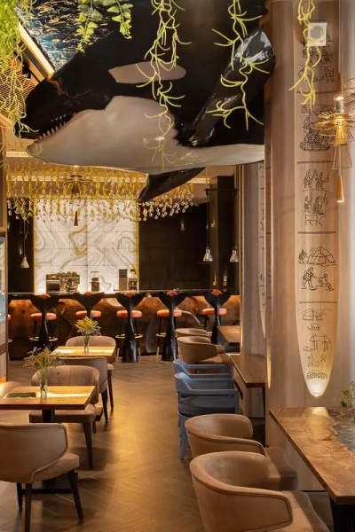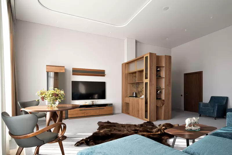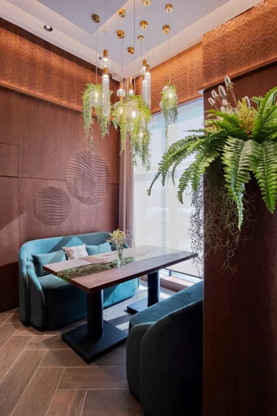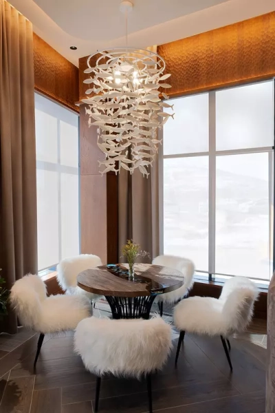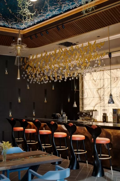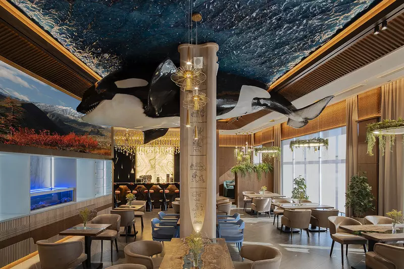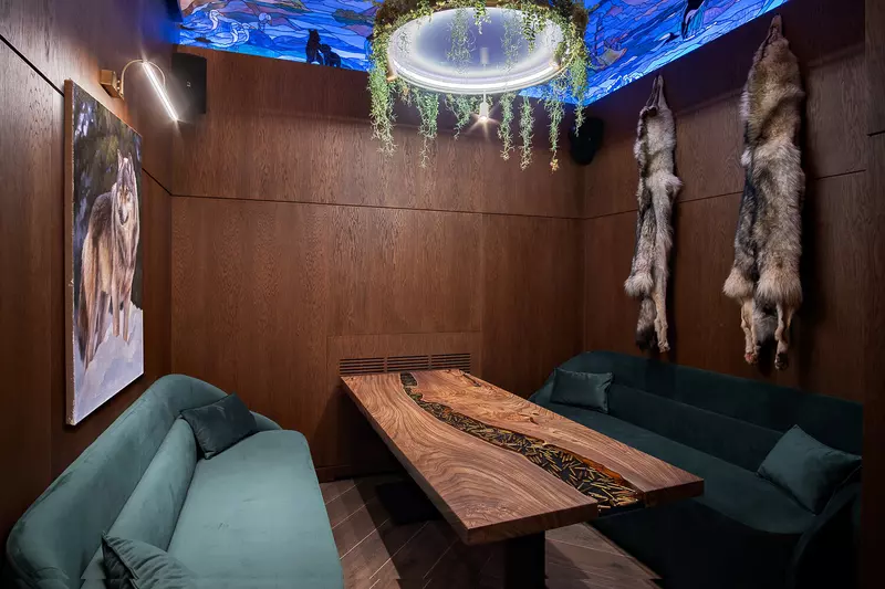 Что касается ресторана, то в его оформлении можно заметить несколько арт-объектов. Например, спинки у стульев имеют очертания хвоста рыбы, декоративными рыбками украшены светильники. А чучело косатки (под потолком) — и медведя, конечно, — еще раз акцентируют темы охоты и рыбалки и являются ярким акцентным штрихом.