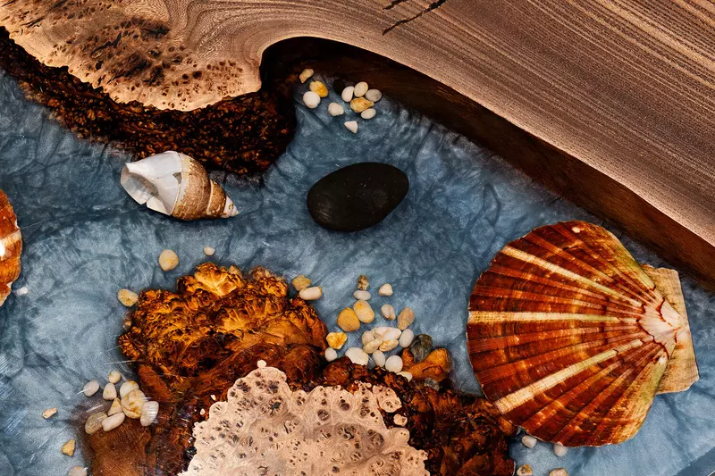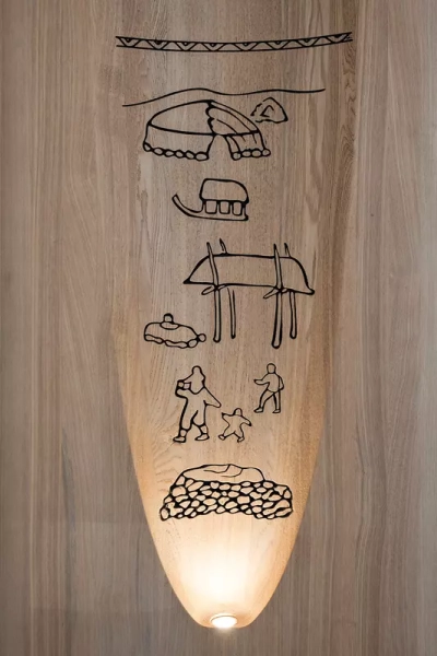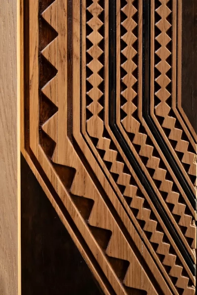 В качестве декора для панно использована сложная техника маркетри, все рисунки и орнаменты взяты из фольклора местных народностей и определяют это место (то есть территорию). Стоит отметить очень квалифицированную работу местной столярной мастерской.