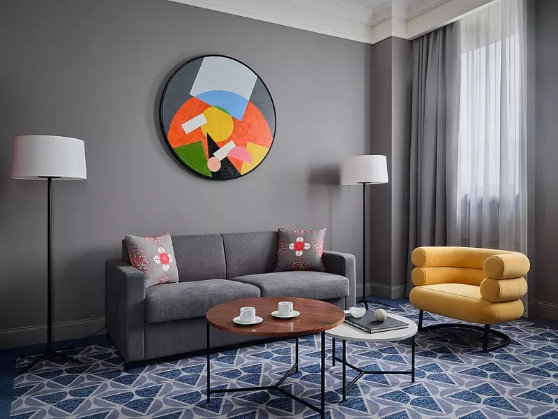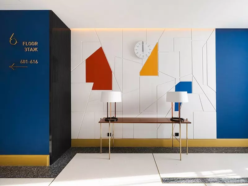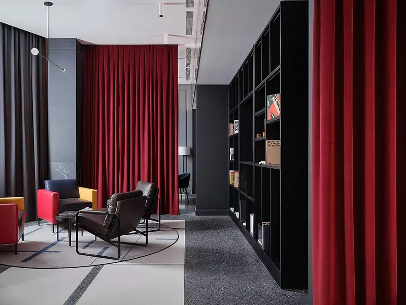 Интерьерами отеля занимался один из лидеров в сфере дизайна гостиничных решений московское бюро Front Architecture. Архитекторы постарались передать связь времен, применяя техники, характерные для авангарда и конструктивизма, но в современном исполнении. Они вдохновлялись принтами Варвары Степановой — ее работы стали источником идей для рисунка ковролина, и супрематическими эскизами Эля Лисицкого и Казимира Малевича, которые в переосмысленном виде легли в основу графичного рисунка полов. Центральную часть лобби украшает световая инсталляция с подвесками из хрусталя, отсылающая к работам Василия Кандинского.